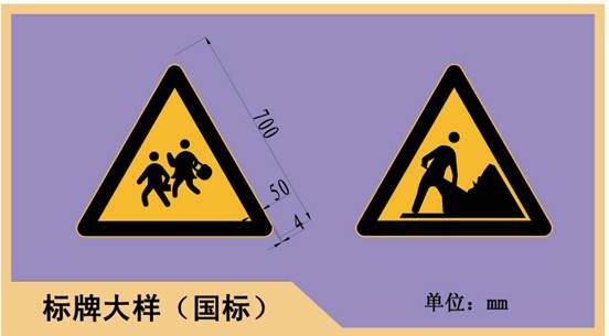 标牌规格依据GB5768-1999《道路交通标志和标线》车速小于40km/h,三角形牌为L700mm。